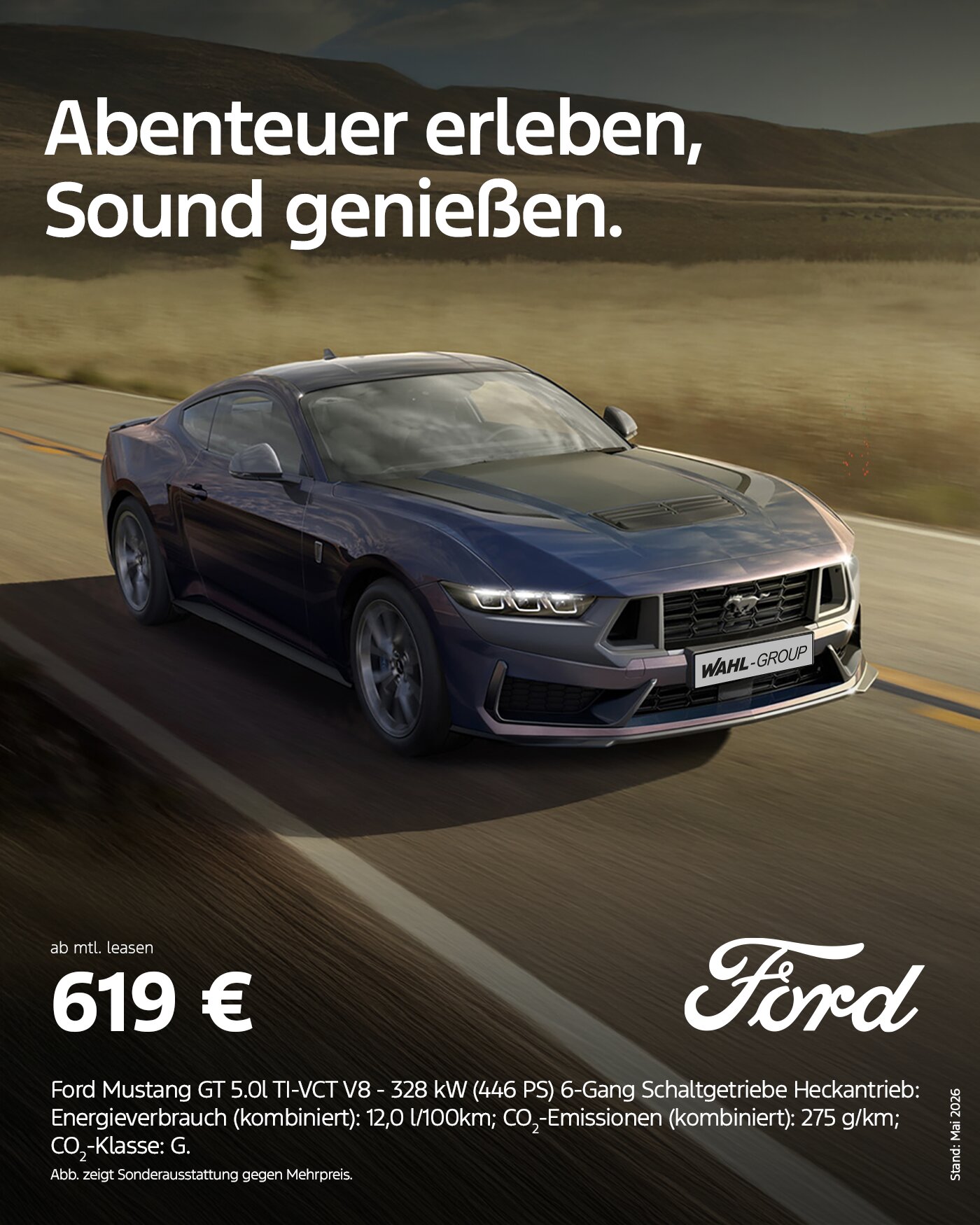 Ein km-Leasing-Angebot der Ford Bank GmbH, Henry-Ford-Str. 1, 50735 Köln, für Privatkunden. Gilt für noch nicht zugelassene, berechtigte Ford Neufahrzeuge bei verbindlicher Kundenbestellung und Abschluss eines Leasingvertrages. Zum Beispiel der Ford Mustang GT Fastback 5.0l TI-VCT V8 - 328 kW (446 PS) 6-Gang Schaltgetriebe Heckantrieb, bei 48 Monaten Laufzeit und 20.000 km Gesamtlaufleistung. Leasingrate zzgl. Überführungs- und Zulassungskosten, Leasing-Sonderzahlung € 5.000,-, voraussichtlicher Gesamtbetrag € 34.712,00,- (Summe aus Leasing-Sonderzahlung und mtl. Leasingraten). Zzgl. bei Vertragsablauf ggf. Mehr- oder Minderkilometer sowie ggf. Ausgleichsbeträge für etwaigen übermäßigen Fzg.-Verschleiß; Mehrkilometer 0,112 €/km, Minderkilometer 0,067€/km (5.000 Mehr- oder Minderkilometer bleiben berechnungsfrei). Angebot gültig bis zum 30.06.2026.