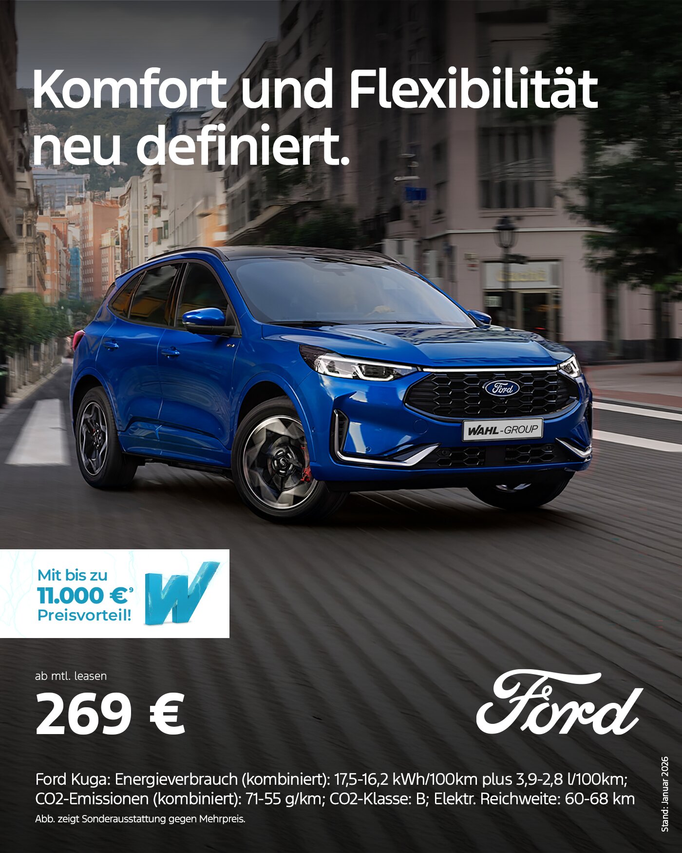 Beispielfoto eines Fahrzeuges der Baureihe. Die Ausstattungsmerkmale des abgebildeten Fahrzeuges sind nicht Bestandteil des Angebotes. Ein km-Leasing-Angebot der Ford Bank GmbH, Henry-Ford-Str. 1, 50735 Köln, für Privatkunden. Gilt für noch nicht zugelassene, berechtigte Ford Neufahrzeuge bei verbindlicher Kundenbestellung und Abschluss eines Leasingvertrages. Zum Beispiel der Ford Kuga, Titanium, 2,5-l-Duratec FHEV 132 kW (180 PS) Stufenloses-Automatikgetriebe (CVT), bei 48 Monaten Laufzeit und 20.000 km Gesamtlaufleistung. Leasingrate zzgl. Überführungs- und Zulassungskosten, Leasing-Sonderzahlung € 4.000,-, voraussichtlicher Gesamtbetrag € 14.992,- (Summe aus Leasing-Sonderzahlung und mtl. Leasingraten). Zzgl. bei Vertragsablauf ggf. Mehr- oder Minderkilometer sowie ggf. Ausgleichsbeträge für etwaigen übermäßigen Fzg.-Verschleiß; Mehrkilometer 0,088€/km, Minderkilometer 0,053€/km (5.000 Mehr- oder Minderkilometer bleiben berechnungsfrei). Im Angebot sind alle verfügbaren Aktionen bereits berücksichtigt. Angebot gültig bis zum 31.03.2026.