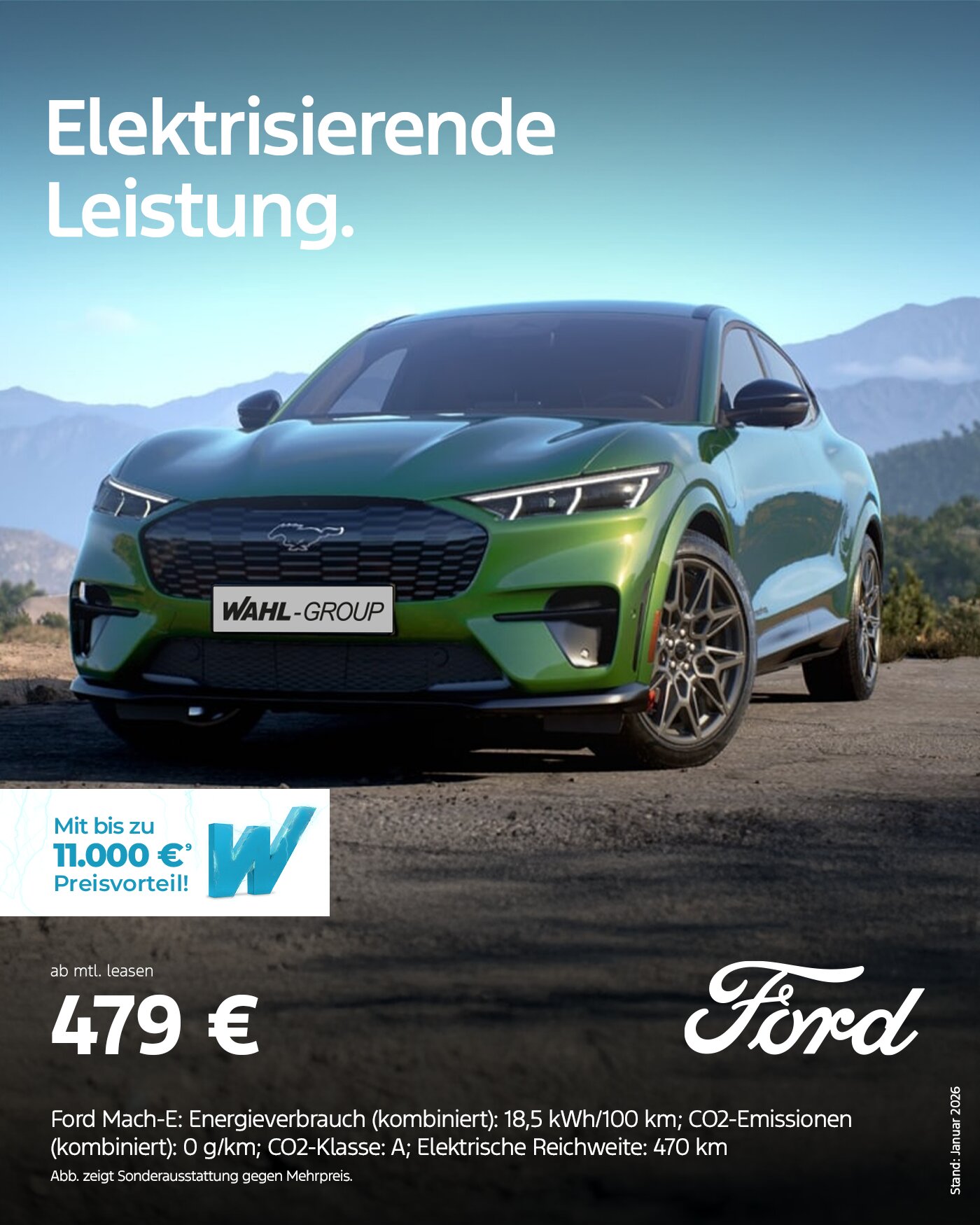 Ein km-Leasing-Angebot der Ford Bank GmbH, Henry-Ford-Str. 1, 50735 Köln, für Privatkunden. Gilt für noch nicht zugelassene, berechtigte Ford Neufahrzeuge bei verbindlicher Kundenbestellung und Abschluss eines Leasingvertrages. Zum Beispiel der Mustang Mach-E, Mach-E, 197kW (268 PS) Elektromotor mit Standard Range, bei 48 Monaten Laufzeit und 20.000 km Gesamtlaufleistung. Leasingrate zzgl. Überführungs- und Zulassungskosten, Leasing-Sonderzahlung € 5.000,-, voraussichtlicher Gesamtbetrag € 27.992,00,- (Summe aus Leasing-Sonderzahlung und mtl. Leasingraten). Zzgl. bei Vertragsablauf ggf. Mehr- oder Minderkilometer sowie ggf. Ausgleichsbeträge für etwaigen übermäßigen Fzg.-Verschleiß; Mehrkilometer 0,112 €/km, Minderkilometer 0,067€/km (5.000 Mehr- oder Minderkilometer bleiben berechnungsfrei). Angebot gültig bis zum 31.03.2026.