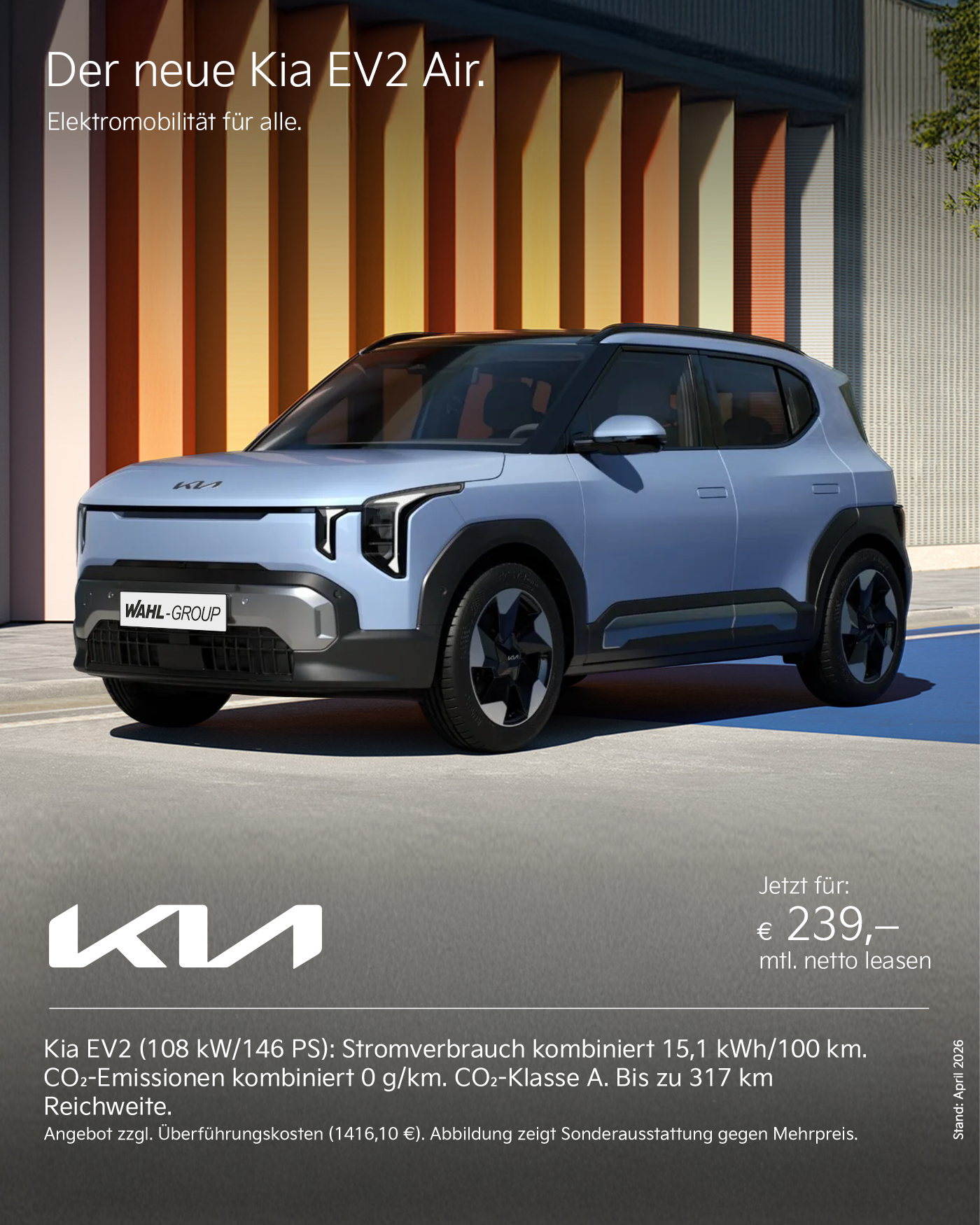 Der neue Kia EV2 Air – Ein innovatives Elektro-SUV mit 146 PS, bis zu 317 km Reichweite, und umfassender Ausstattung – jetzt für 239 € monatlich leasen bei der Wahl-Group!