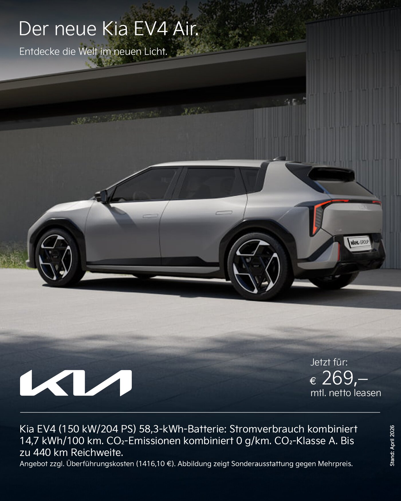 Ein unverbindliches Privat-Leasingangebot (Kilometerleasing) von KIA Leasing. KIA Leasing ist ein Service der Allane SE, Dr.-Carl-von-Linde-Straße 2, 82049 Pullach. Kia EV4 58 kWh 150 kW Air Frontantrieb, SUV, 5 Türen, Elektro, 1-Gang Automatik – Anschaffungspreis 37.590 EUR, 0,00 EUR Leasingsonderzahlung, 269,00 EUR mtl. Leasingrate, 48 Leasingraten, 5.000 km Laufleistung pro Jahr, 12.912,00 EUR Gesamtbetrag aller Raten & Sonderzahlungen zzgl. Überführungskosten i.H.v. 1.416,10 EUR, Bonität vorausgesetzt.