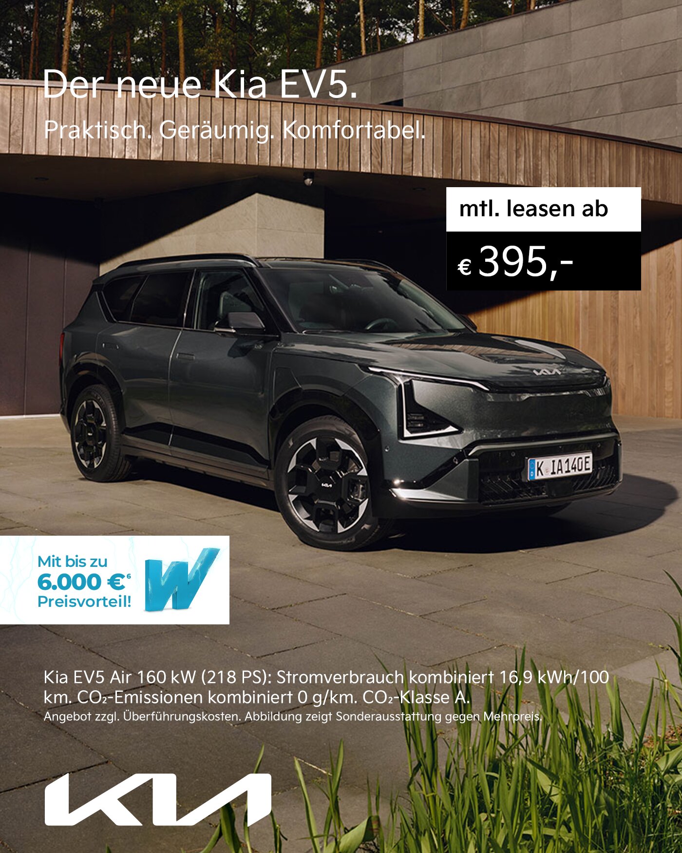 Kia EV5 GT-Line 160 kW (218 PS): Stromverbrauch kombiniert 17,8 kWh/100 km. CO₂-Emissionen kombiniert 0 g/km. CO₂-Klasse A. Bis zu 505 km Reichweite. ¹
