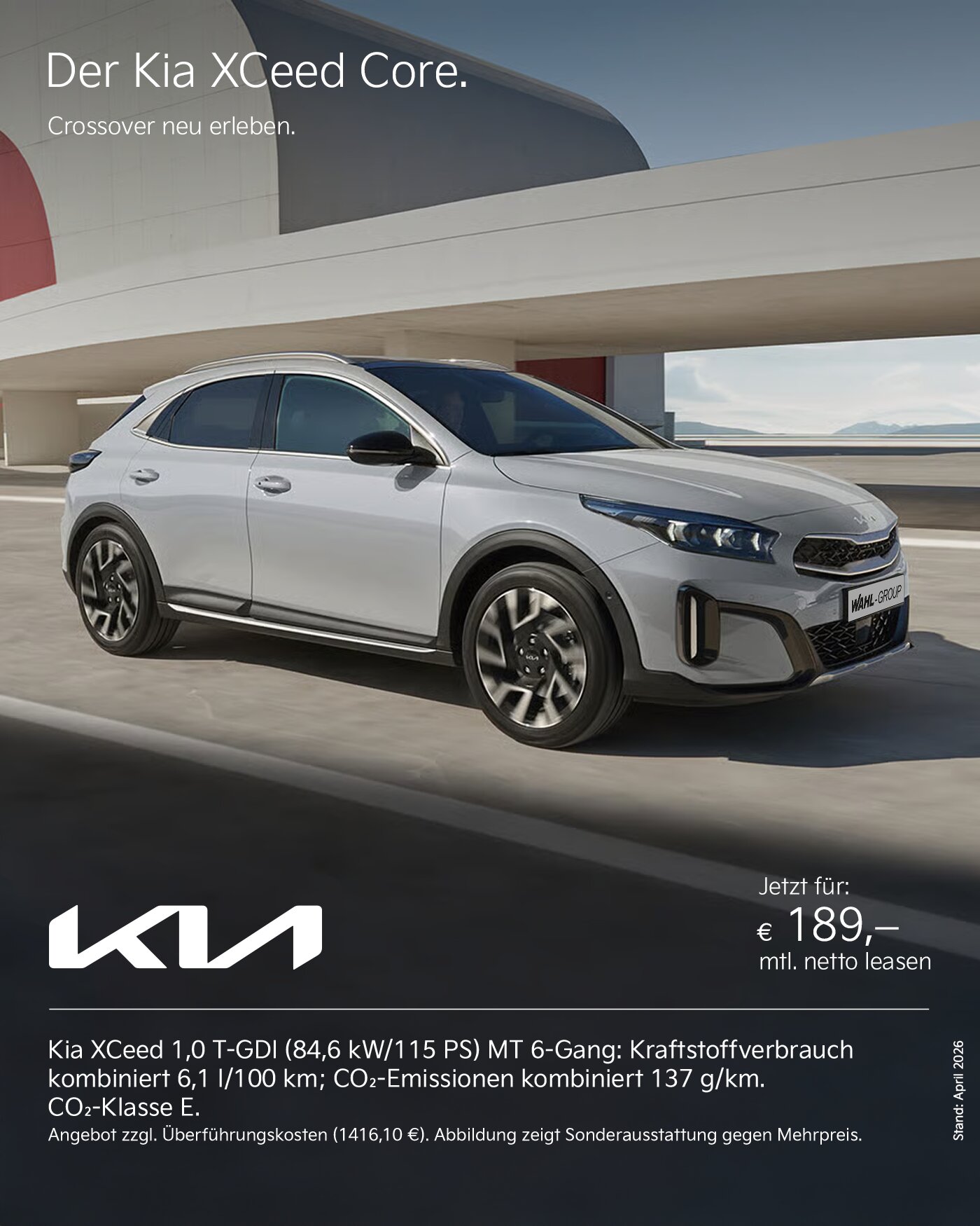 Ein unverbindliches Privat-Leasingangebot (Kilometerleasing) von KIA Leasing. KIA Leasing ist ein Service der Allane SE, Dr.-Carl-von-Linde-Straße 2, 82049 Pullach. Kia XCeed 1.0 T-GDI Core (Benzin, 6-Gang)– Anschaffungspreis 26.990,00 EUR, 0,00 EUR Leasingsonderzahlung, 189,00 EUR mtl. Leasingrate, 48 Leasingraten, 5.000 km Laufleistung pro Jahr, 9.072,00 EUR Gesamtbetrag aller Raten & Sonderzahlungen zzgl. Überführungskosten, Bonität vorausgesetzt. .