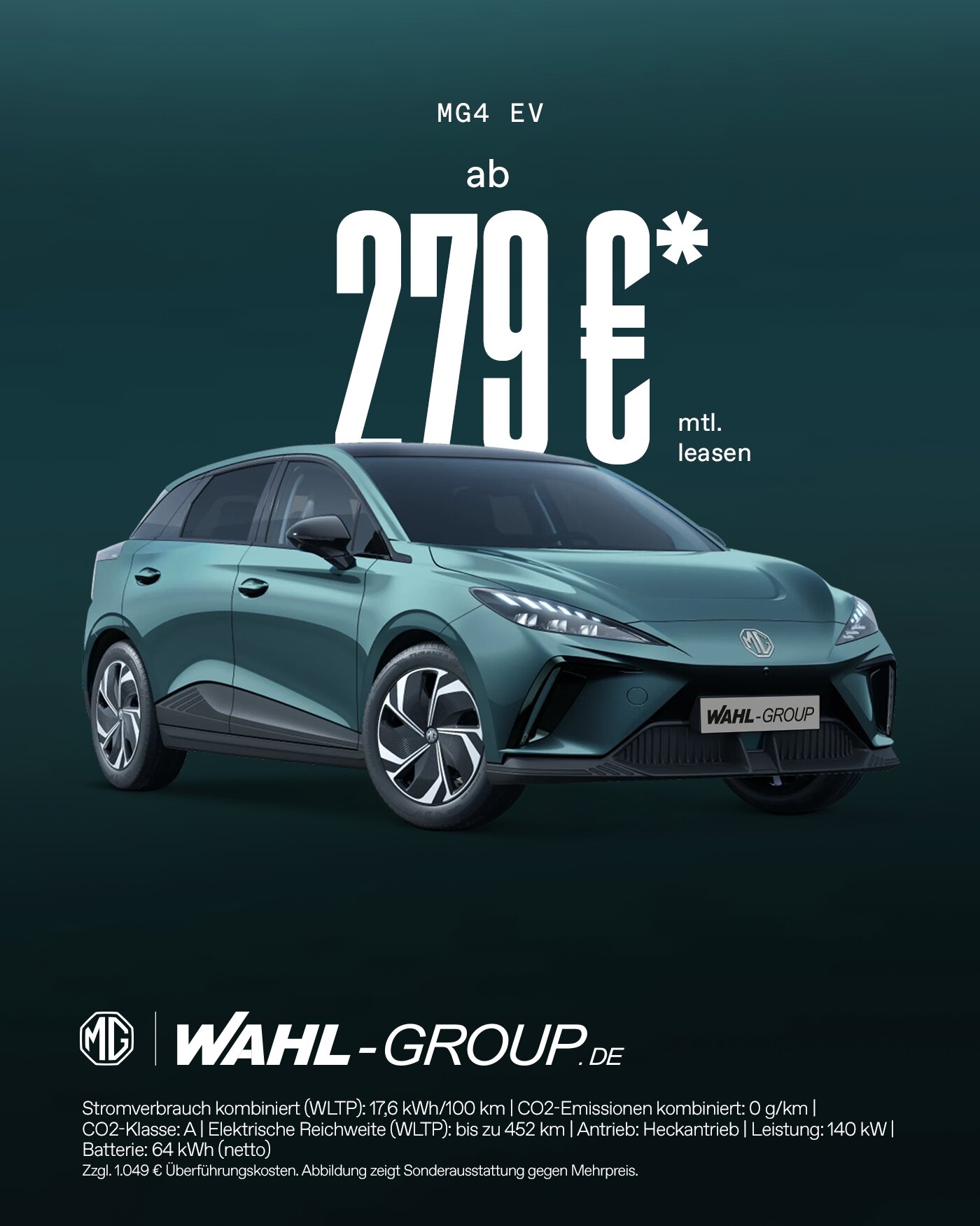 *Die angegebenen Verbrauchs- und Emissionswerte wurden nach den gesetzlich vorgeschriebenen Messverfahren ermittelt. WLTP (Worldwide Harmonised Light-Duty Vehicles Test Procedure, dt. weltweit einheitliches Leichtfahrzeuge-Testverfahren): Bei diesem Verfahren werden Kraftstoff-, Strom- und Energieverbrauch, Reichweite und Emissionen von Personenkraftfahrzeugen in Europa gemessen. Die Modelle sollen dadurch besser an die realen Gegebenheiten im Straßenverkehr angepasst werden. Die Reichweite hängt von der Umgebungstemperatur, der Batterieladung und deren Zustand, dem Fahrstil, der Zuladung, der Fahrzeugelektronik und den Einstellungen für Heizung und Klimaanlage ab. Weitere Informationen unterwww.mgmotor.de/dat-hinweis. Weitere Informationen zum offiziellen Kraftstoffverbrauch und den offiziellen spezifischen CO2-Emissionen neuer Personenkraftwagen können dem 'Leitfaden über den Kraftstoffverbrauch, die CO2-Emissionen und den Stromverbrauch neuer Personenkraftwagen' entnommen werden, der an allen Verkaufsstellen und bei der DAT Deutsche Automobil Treuhand GmbH, Hellmuth-Hirth-Str.1, 73760 Ostfildern, Deutschland oder unter www.dat.de unentgeltlich erhältlich ist