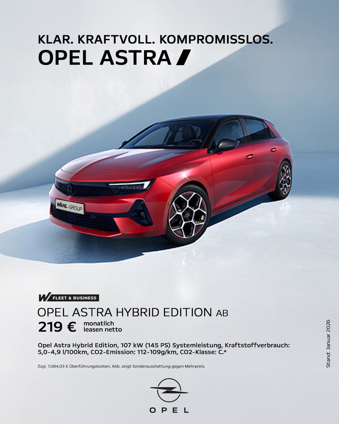 Ein Kilometerleasingangebot für Gewerbekunden (Bonität vorausgesetzt) der Stellantis Bank SA Niederlassung Deutschland, Siemensstraße 10, 63263 Neu-Isenburg. Opel Astra 5-Türer Hybrid Edition 107kW (145 PS):, Anschaffungspreis netto 25.807,00 €, zzgl. 1084,03 € (separate Berechnung) Transportkosten netto, 0 € Sonderzahlung, 219,- € mtl. Leasingrate, 48 Leasingraten, 10.000 km Laufleistung pro Jahr, 10.512,00 € Gesamtbetrag netto aller Raten & Sonderzahlungen zzgl. 1084.03 € (separate Berechnung) Transportkosten netto. Bonität vorausgesetzt. Das Leasingangebot gilt nur für Gewerbekunden. Angebot gilt bis zum 31.03.2026. Weitere Informationen zum Fahrzeug und zu Kauf, Leasing und Finanzierung erhalten Sie bei uns.