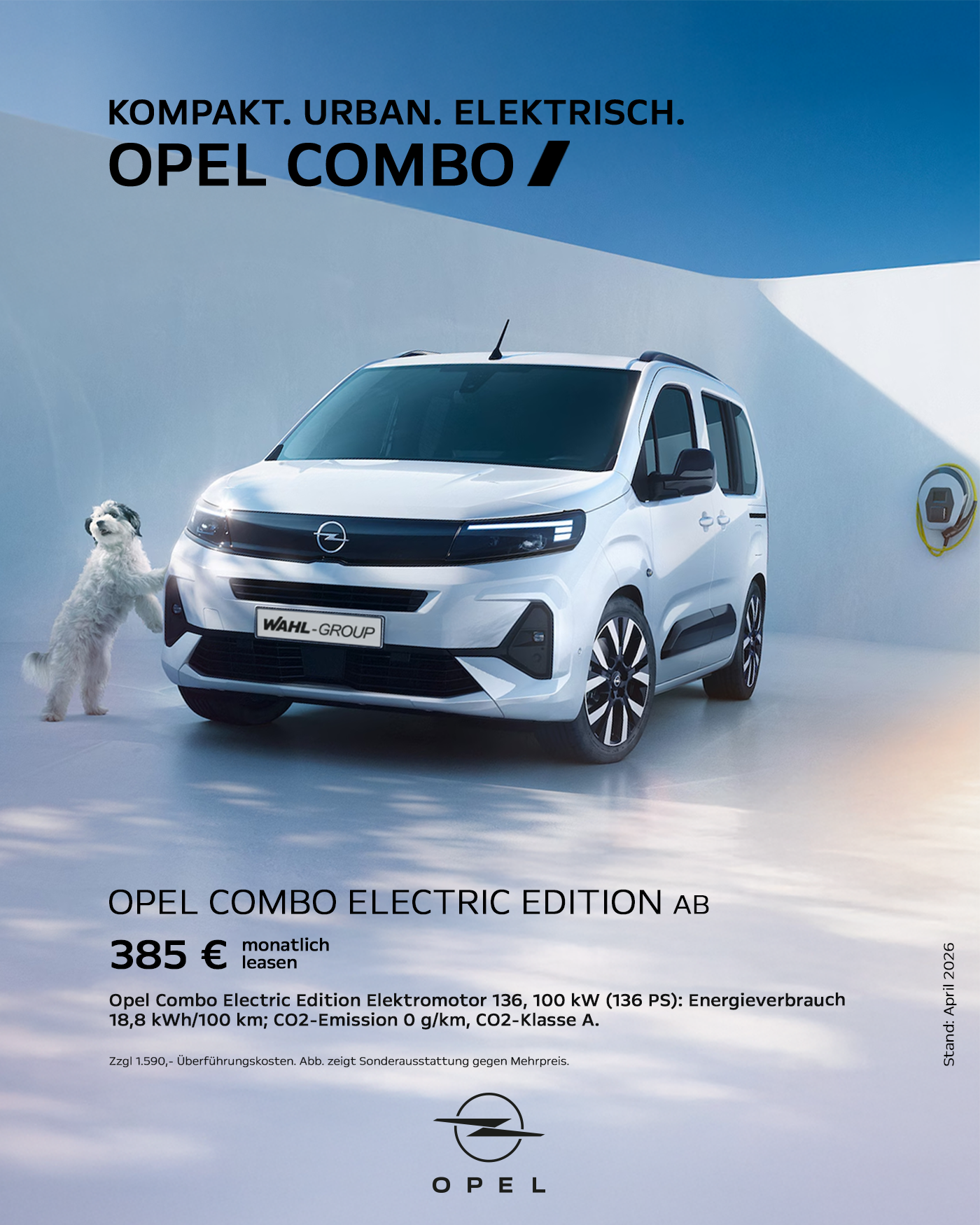 Ein Kilometerleasingangebot für Privatkunden (Bonität vorausgesetzt) der Stellantis Bank SA Niederlassung Deutschland, Siemensstraße 10, 63263 Neu-Isenburg. Opel Combo Electric Edition Elektromotor 136, 100 kW (136 PS), Anschaffungspreis 38.600,00 €, zzgl. 1.290,00 € (separate Berechnung) Transportkosten, 3.000,00 € Sonderzahlung, 385,00 € mtl. Leasingrate, 36 Leasingraten, 10.000 km Laufleistung pro Jahr, 21.480,00 € Gesamtbetrag aller Raten & Sonderzahlungen zzgl. 1.290,00 € (separate Berechnung) Transportkosten. Bonität vorausgesetzt. Das Leasingangebot gilt nur für Privatkunden. Angebot gilt bis zum 30.06.2026. Weitere Informationen zum Fahrzeug und zu Kauf, Leasing und Finanzierung erhalten Sie bei uns.