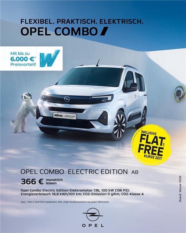 Ein Kilometerleasingangebot für Privatkunden (Bonität vorausgesetzt) der Stellantis Bank SA Niederlassung Deutschland, Siemensstraße 10, 63263 Neu-Isenburg. Opel Combo Electric Edition Elektromotor 136, 100 kW (136 PS), Anschaffungspreis 38.600,00 €, zzgl. 1.290,00 € (separate Berechnung) Transportkosten, 3.000,00 € Sonderzahlung, 366,00 € mtl. Leasingrate, 36 Leasingraten, 10.000 km Laufleistung pro Jahr, 20.568,00 € Gesamtbetrag aller Raten & Sonderzahlungen zzgl. 1.290,00 € (separate Berechnung) Transportkosten. Bonität vorausgesetzt. Das Leasingangebot gilt nur für Privatkunden. Angebot gilt bis zum 31.03.2026. Weitere Informationen zum Fahrzeug und zu Kauf, Leasing und Finanzierung erhalten Sie bei uns.
