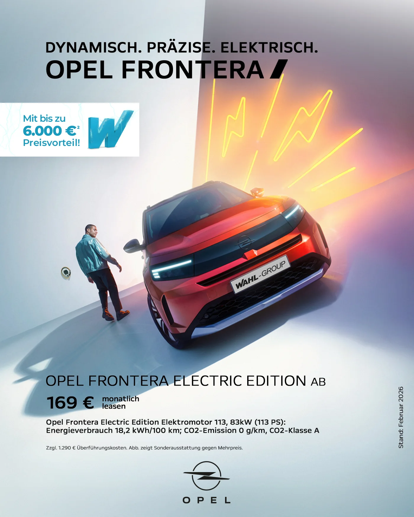 Ein Kilometerleasingangebot für Privatkunden (Bonität vorausgesetzt) der Stellantis Bank SA Niederlassung Deutschland, Siemensstraße 10, 63263 Neu-Isenburg. Opel Frontera Electric Edition 83kW (113PS):, Anschaffungspreis 28.990,00 €, zzgl. 1.290,00 € (separate Berechnung) Transportkosten, 3.000,00 € Sonderzahlung, 169,00 € mtl. Leasingrate, 36 Leasingraten, 10.000 km Laufleistung pro Jahr, 9.084,00 € Gesamtbetrag aller Raten & Sonderzahlungen zzgl. 1.290,00 € (separate Berechnung) Transportkosten. Bonität vorausgesetzt. Das Leasingangebot gilt nur für Privatkunden. Angebot gilt bis zum 31.03.2026. Weitere Informationen zum Fahrzeug und zu Kauf, Leasing und Finanzierung erhalten Sie bei uns.