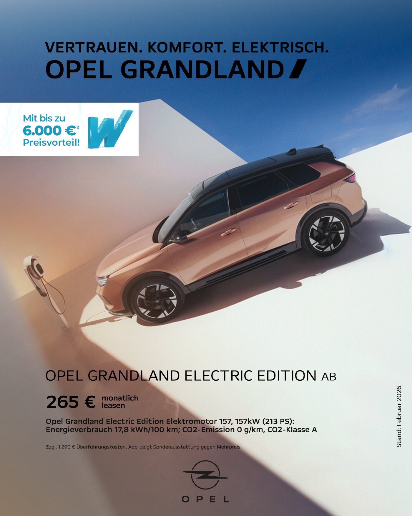 Ein Kilometerleasingangebot für Privatkunden (Bonität vorausgesetzt) der Stellantis Bank SA Niederlassung Deutschland, Siemensstraße 10, 63263 Neu-Isenburg. Opel Grandland Electric Edition 157kW (213PS):, Anschaffungspreis 46.950,00 €, zzgl. 1.290,00 € (separate Berechnung) Transportkosten, 3.000,00 € Sonderzahlung, 265,00 € mtl. Leasingrate, 36 Leasingraten, 10.000 km Laufleistung pro Jahr, 12.540,00 € Gesamtbetrag aller Raten & Sonderzahlungen zzgl. 1.290,00 € (separate Berechnung) Transportkosten. Bonität vorausgesetzt. Das Leasingangebot gilt nur für Privatkunden. Angebot gilt bis zum 31.03.2026. Weitere Informationen zum Fahrzeug und zu Kauf, Leasing und Finanzierung erhalten Sie bei uns.