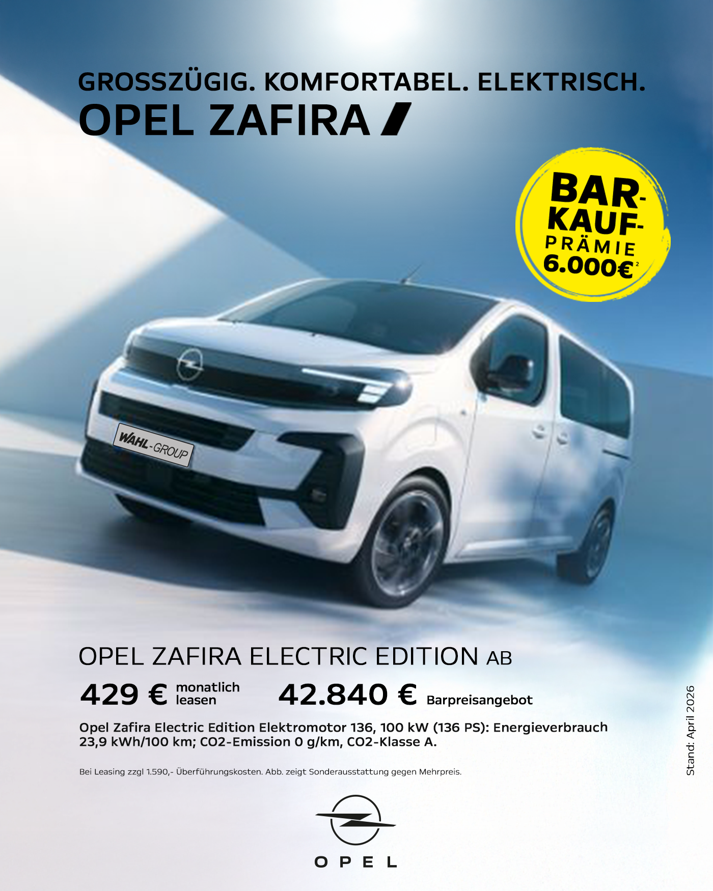 Ein Kilometerleasingangebot für Privatkunden (Bonität vorausgesetzt) der Stellantis Bank SA Niederlassung Deutschland, Siemensstraße 10, 63263 Neu-Isenburg. Opel Zafira Electric Edition 100kW (136 PS):, Anschaffungspreis 47.550,00 €, zzgl. 1.590,00 € (separate Berechnung) Transportkosten, 3.000,00 € Sonderzahlung, 429,00 € mtl. Leasingrate, 48 Leasingraten, 10.000 km Laufleistung pro Jahr, 23.592,00 € Gesamtbetrag aller Raten & Sonderzahlungen zzgl. 1.590,00 € (separate Berechnung) Transportkosten. Bonität vorausgesetzt. Das Leasingangebot gilt nur für Privatkunden. Angebot gilt bis zum 30.06.2026. Weitere Informationen zum Fahrzeug und zu Kauf, Leasing und Finanzierung erhalten Sie bei uns.