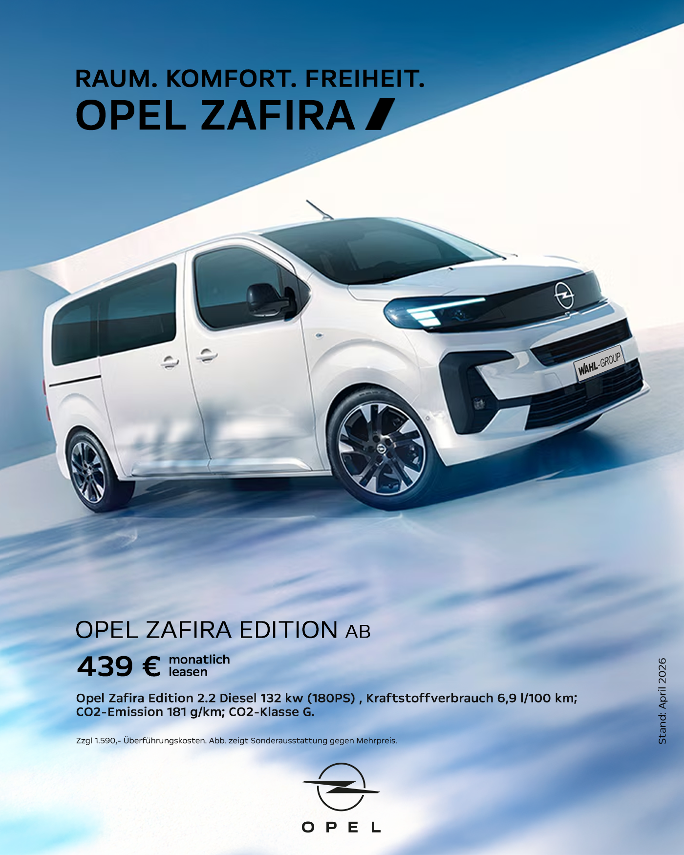 Ein Kilometerleasingangebot für Privatkunden (Bonität vorausgesetzt) der Stellantis Bank SA Niederlassung Deutschland, Siemensstraße 10, 63263 Neu-Isenburg. Opel Zafira Edition Diesel 132kW (180 PS):, Anschaffungspreis 39.950,00 €, zzgl. 1.590,00 € (separate Berechnung) Transportkosten, 0 € Sonderzahlung, 439,00 € mtl. Leasingrate, 48 Leasingraten, 10.000 km Laufleistung pro Jahr, 21.072,00 € Gesamtbetrag aller Raten & Sonderzahlungen zzgl. 1.590,00 € (separate Berechnung) Transportkosten. Bonität vorausgesetzt. Das Leasingangebot gilt nur für Privatkunden. Angebot gilt bis zum 30.06.2026. Weitere Informationen zum Fahrzeug und zu Kauf, Leasing und Finanzierung erhalten Sie bei uns.