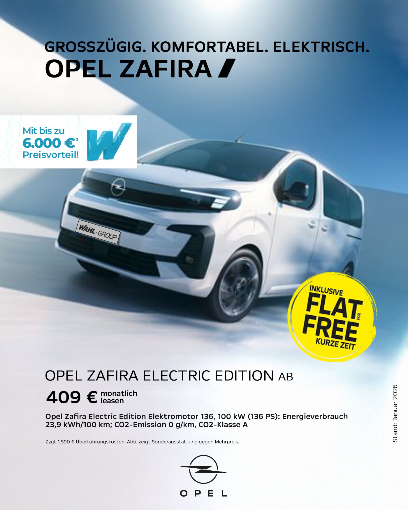 Ein Kilometerleasingangebot für Privatkunden (Bonität vorausgesetzt) der Stellantis Bank SA Niederlassung Deutschland, Siemensstraße 10, 63263 Neu-Isenburg. Opel Zafira Electric Edition 100kW (136 PS):, Anschaffungspreis 47.550,00 €, zzgl. 1.590,00 € (separate Berechnung) Transportkosten, 3.000,00 € Sonderzahlung, 409,00 € mtl. Leasingrate, 48 Leasingraten, 10.000 km Laufleistung pro Jahr, 22.632,00 € Gesamtbetrag aller Raten & Sonderzahlungen zzgl. 1.590,00 € (separate Berechnung) Transportkosten. Bonität vorausgesetzt. Das Leasingangebot gilt nur für Privatkunden. Angebot gilt bis zum 31.03.2026. Weitere Informationen zum Fahrzeug und zu Kauf, Leasing und Finanzierung erhalten Sie bei uns.