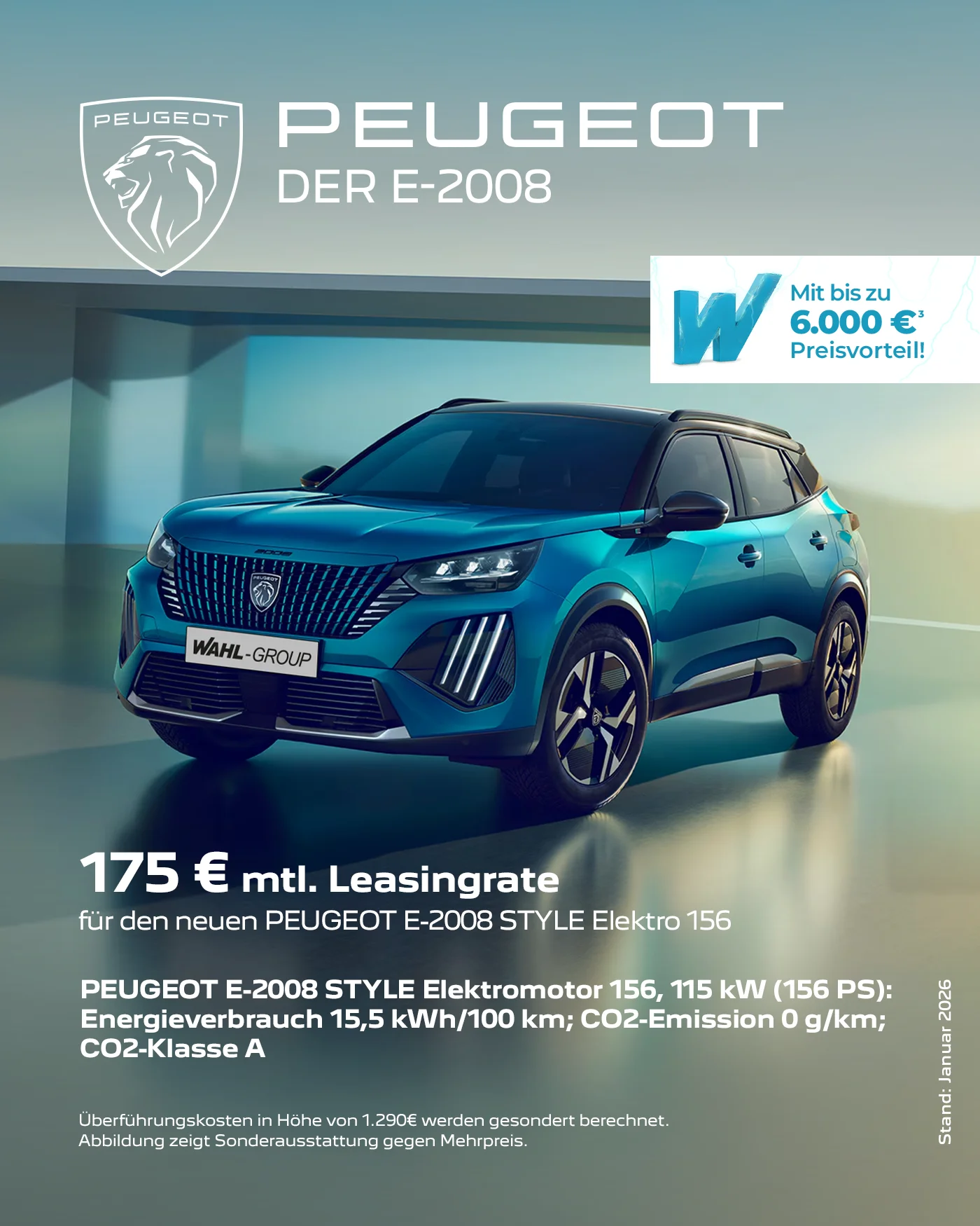 Ein Kilometerleasingangebot für Privatkunden (Bonität vorausgesetzt) der Stellantis Bank SA Niederlassung Deutschland, Siemensstraße 10, 63263 Neu-Isenburg. PEUGEOT E-2008 STYLE Elektro 156, 115 kW (156 PS): Anschaffungspreis 40.550,00 €, zzgl. 1.290,00 € (separate Berechnung) Transportkosten, 3.000,00 € Sonderzahlung, 175,00 € mtl. Leasingrate, 36 Leasingraten, 10.000 km Laufleistung pro Jahr, 9.300,00 € Gesamtbetrag aller Raten & Sonderzahlungen zzgl. 1.290,00 € (separate Berechnung) Transportkosten. Bonität vorausgesetzt.