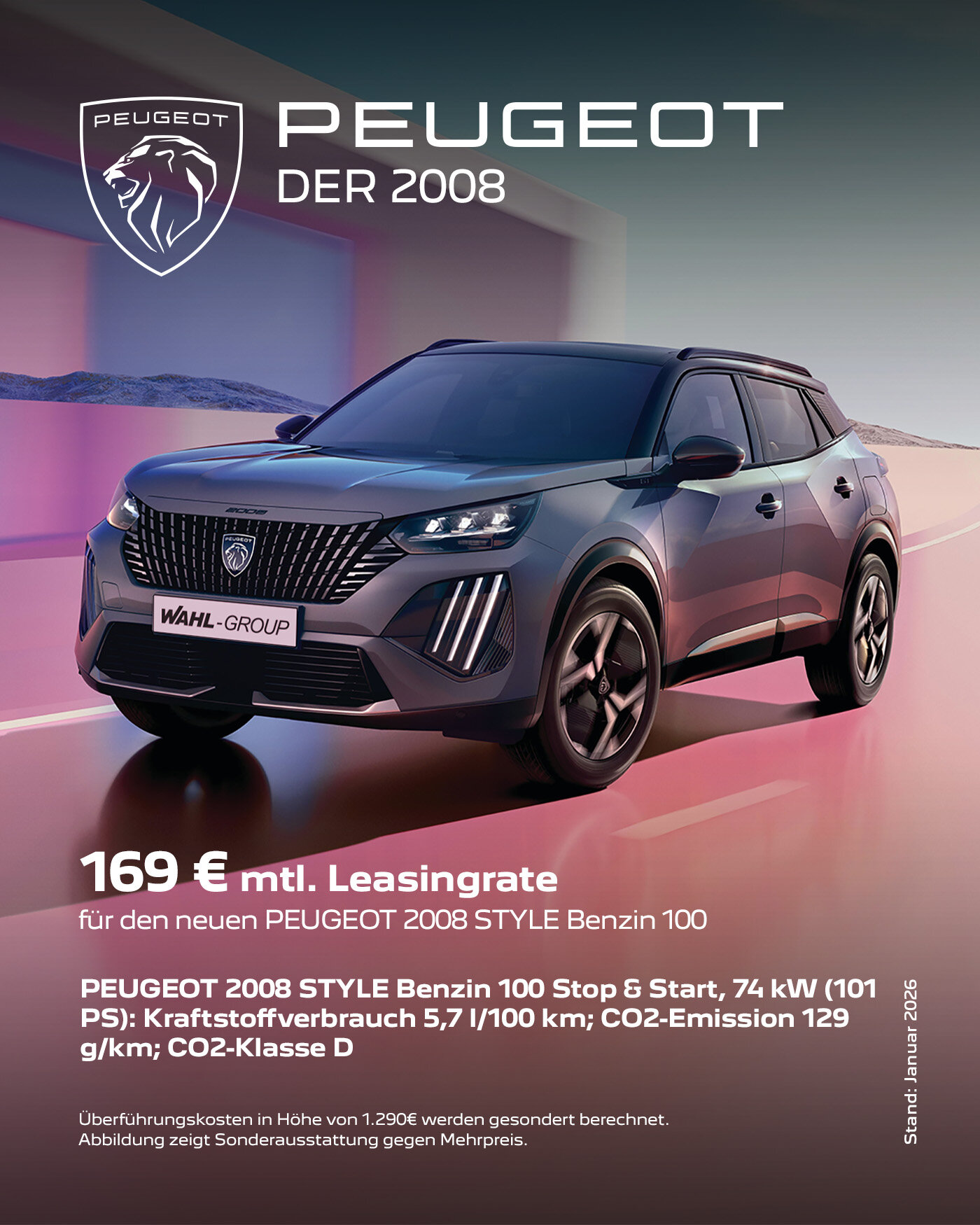 Der City-SUV PEUGEOT 2008 begeistert mit kompaktem Design, PEUGEOT 3D i-Cockpit®* und zahlreichen innovativen Technologien, die ein einzigartiges Fahrerlebnis bieten. Steigen Sie jetzt direkt in unseren City-SUV ein und profitieren Sie von unserem attraktiven Angebot.
