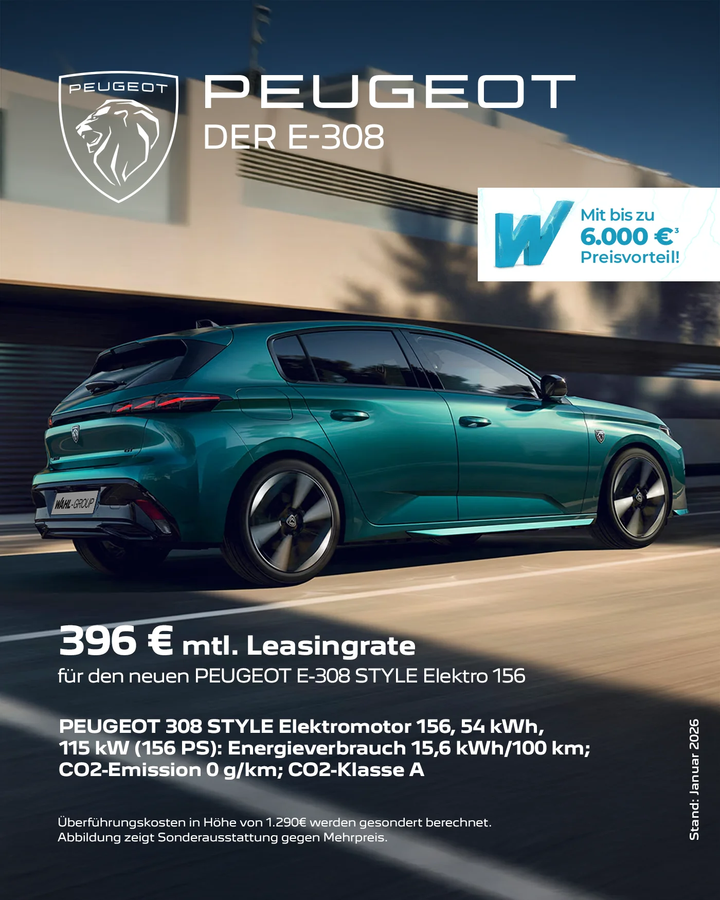 Ein Kilometerleasingangebot für Privatkunden (Bonität vorausgesetzt) der Stellantis Bank SA Niederlassung Deutschland, Siemensstraße 10, 63263 Neu-Isenburg. PEUGEOT E-308 STYLE Elektro 156, 115 kW (156 PS): Anschaffungspreis 42.435,00 €, zzgl. 1.290,00 € (separate Berechnung) Transportkosten, 3.000,00 € Sonderzahlung, 396,00 € mtl. Leasingrate, 48 Leasingraten, 10.000 km Laufleistung pro Jahr, 22.008,00 € Gesamtbetrag aller Raten & Sonderzahlungen zzgl. 1.290,00 € (separate Berechnung) Transportkosten. Bonität vorausgesetzt.