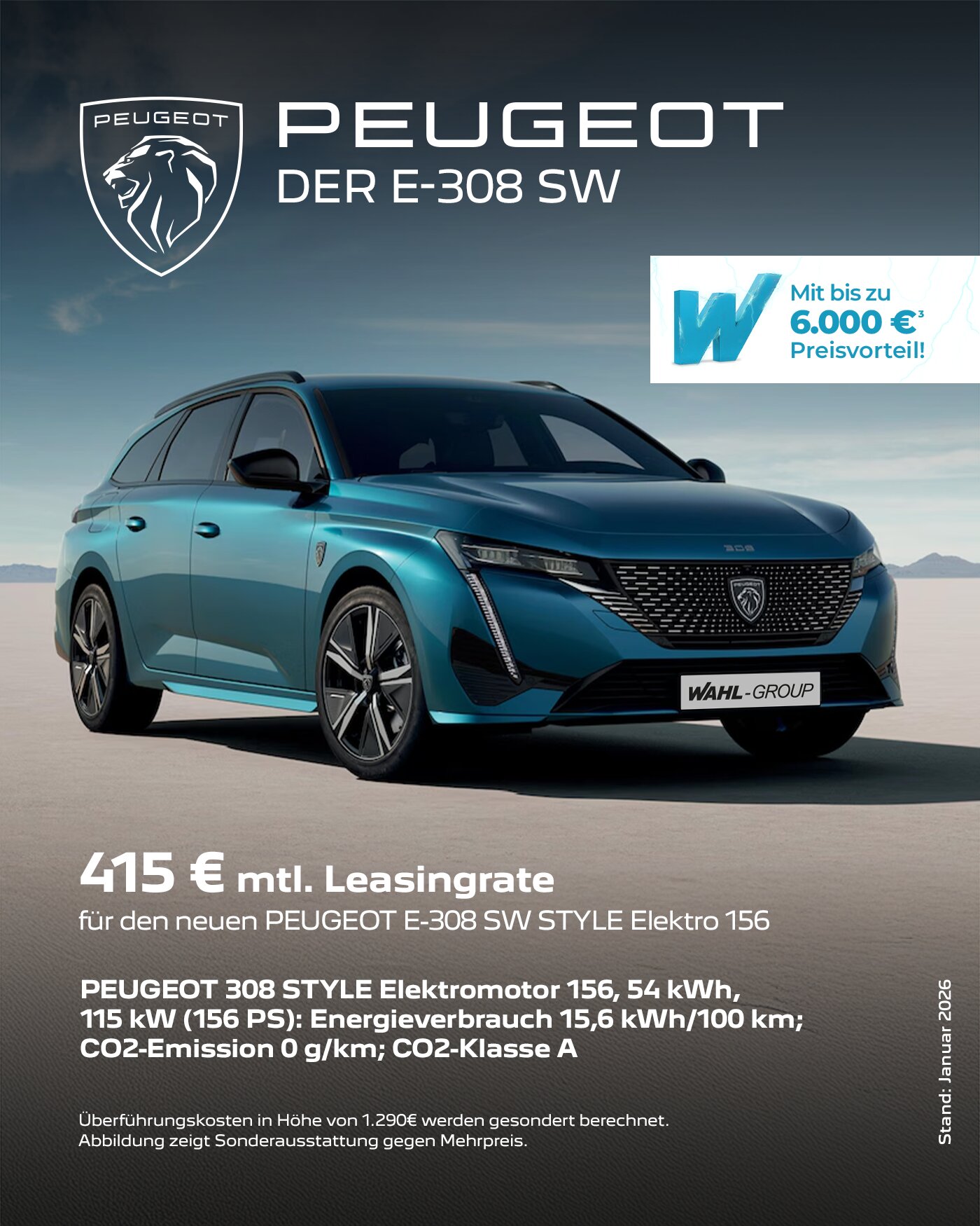 Ein Kilometerleasingangebot für Privatkunden (Bonität vorausgesetzt) der Stellantis Bank SA Niederlassung Deutschland, Siemensstraße 10, 63263 Neu-Isenburg. PEUGEOT E-308 SW STYLE Elektro 156, 115 kW (156 PS): Anschaffungspreis 43.435,00 €, zzgl. 1.290,00 € (separate Berechnung) Transportkosten, 3.000,00 € Sonderzahlung, 415,00 € mtl. Leasingrate, 48 Leasingraten, 10.000 km Laufleistung pro Jahr, 22.920,00 € Gesamtbetrag aller Raten & Sonderzahlungen zzgl. 1.290,00 € (separate Berechnung) Transportkosten. Bonität vorausgesetzt.