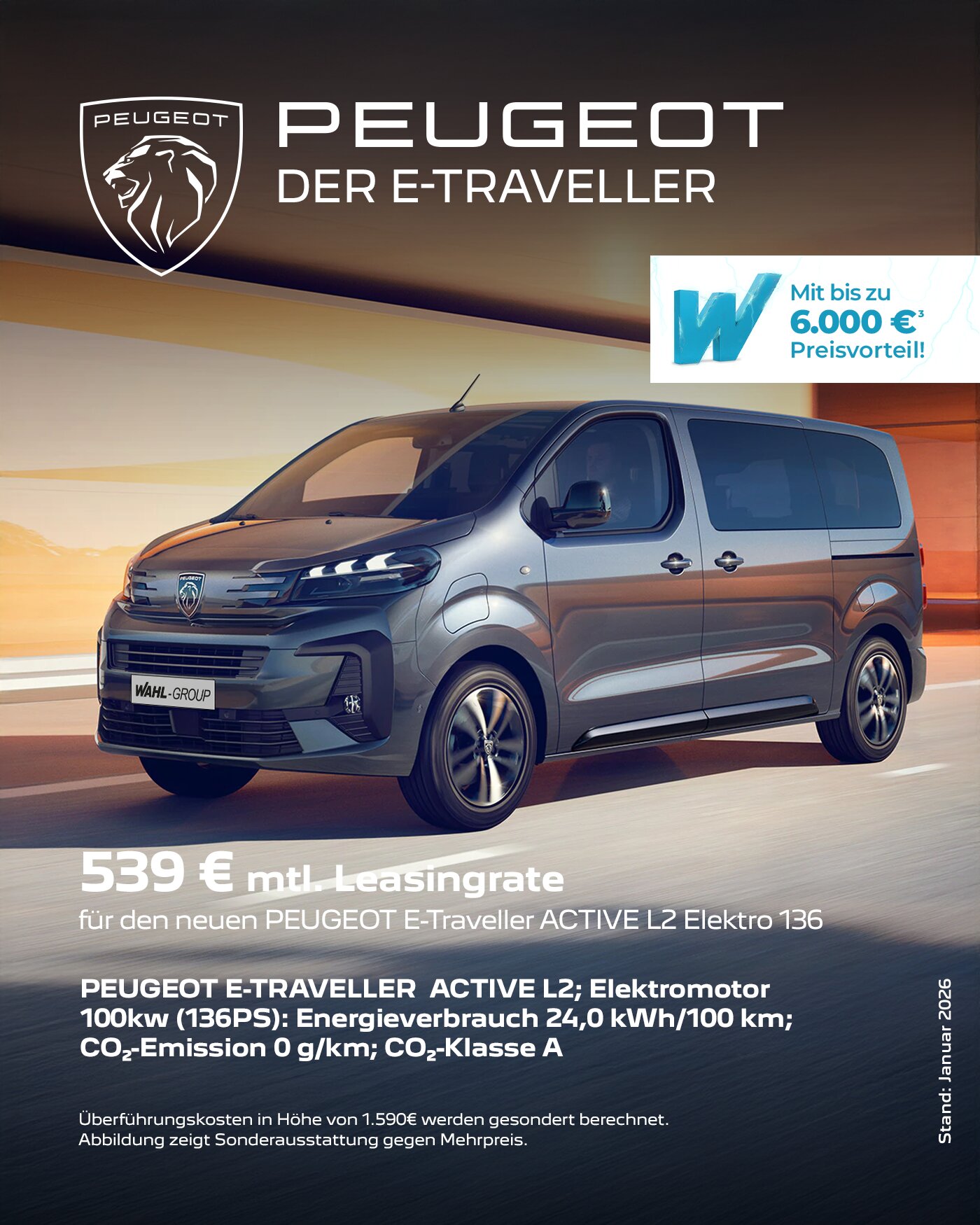 Ein Kilometerleasingangebot für Privatkunden (Bonität vorausgesetzt) der Stellantis Bank SA Niederlassung Deutschland, Siemensstraße 10, 63263 Neu-Isenburg. PEUGEOT E-TRAVELLER ACTIVE L2; Elektromotor 100kw (136PS): Anschaffungspreis 46.330,00 €, zzgl. 1.290,00 € (separate Berechnung) Transportkosten, 3.000,00 € Sonderzahlung, 539,00 € mtl. Leasingrate, 48 Leasingraten, 10.000 km Laufleistung pro Jahr, 28.872,00 € Gesamtbetrag aller Raten & Sonderzahlungen zzgl. 1.290,00 € (separate Berechnung) Transportkosten. Bonität vorausgesetzt.