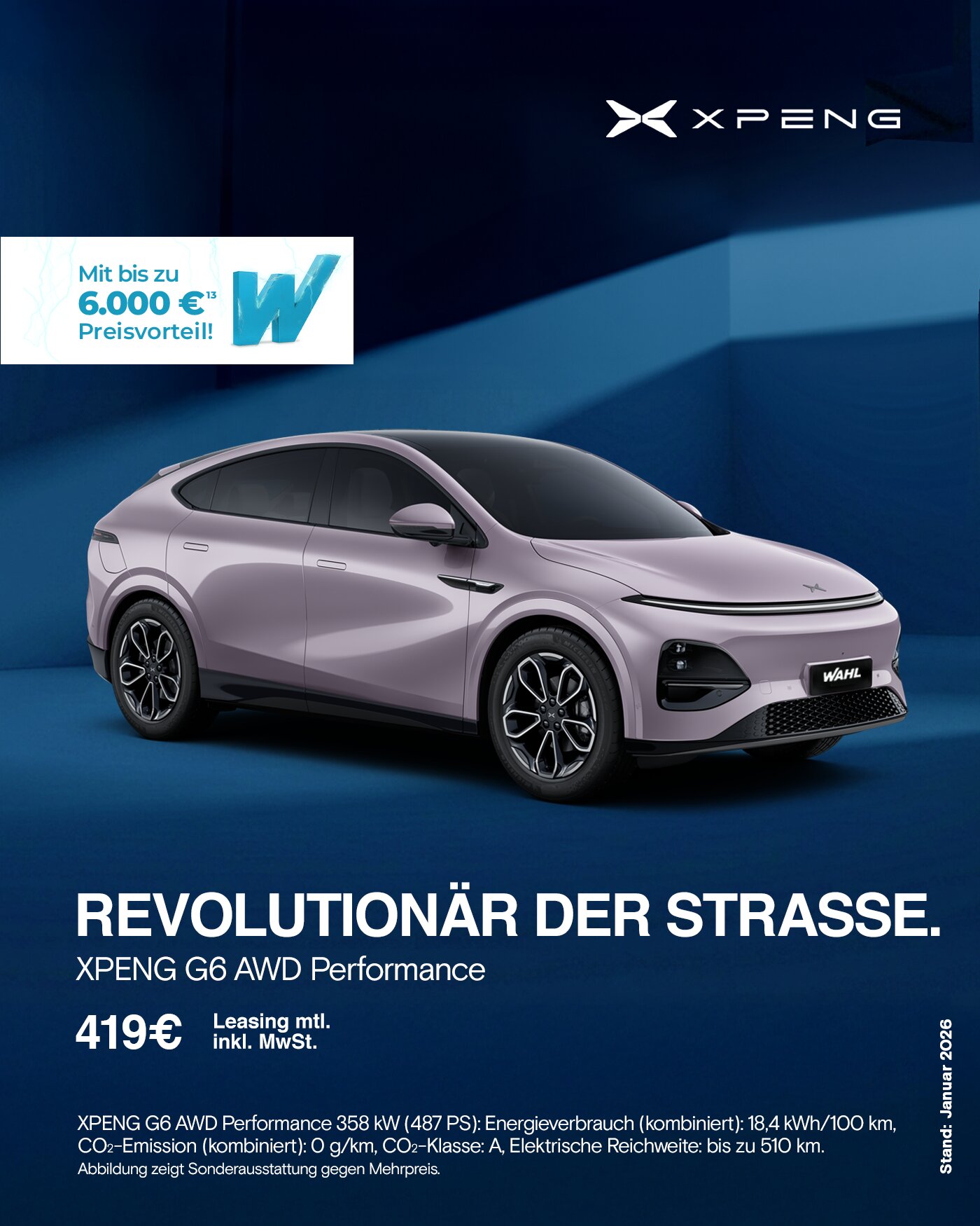 Ein unverbindliches Privat- oder Gewerbeleasingangebot der Bank ARVAL Deutschland GmbH, Bajuwarenring 5, 82041 Oberhaching für das Fahrzeug: XPENG G6. Alle Preise verstehen sich inkl. bzw. zzgl. MwSt und zzgl. 1.400,00 EUR (inkl. bzw. zzgl. MwSt, seperate Berechnung) Transportkosten. Angebot gilt bis zum 31.03.2026. Abbildung zeigt Sonderausstattung gegen Mehrpreis.