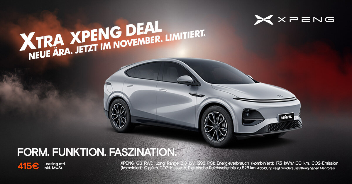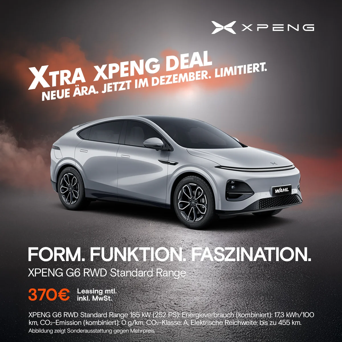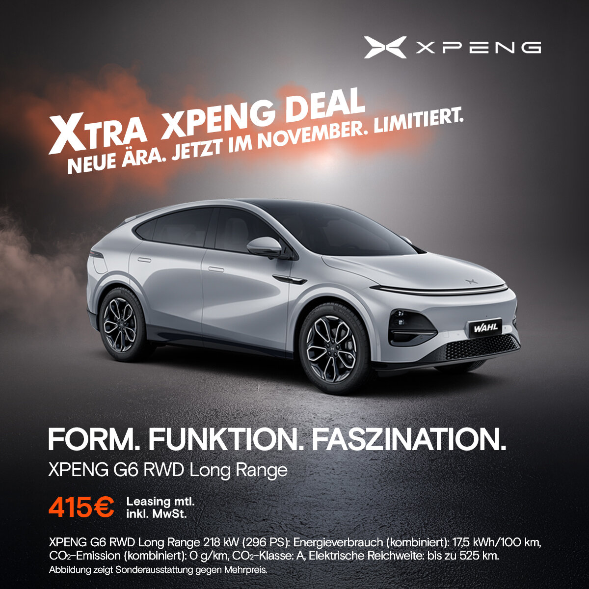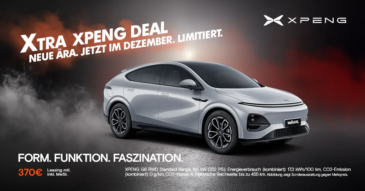 Ein unverbindliches Privat-Leasingangebot der Bank ARVAL Deutschland GmbH, Bajuwarenring 5, 82041 Oberhaching für das Fahrzeug: XPENG G6. Alle Preise verstehen sich inkl. MwSt und zzgl. 1.400,00 EUR (inkl. MwSt, seperate Berechnung) Transportkosten. Angebot gilt bis zum 31.12.2025. Abbildung zeigt Sonderausstattung gegen Mehrpreis.