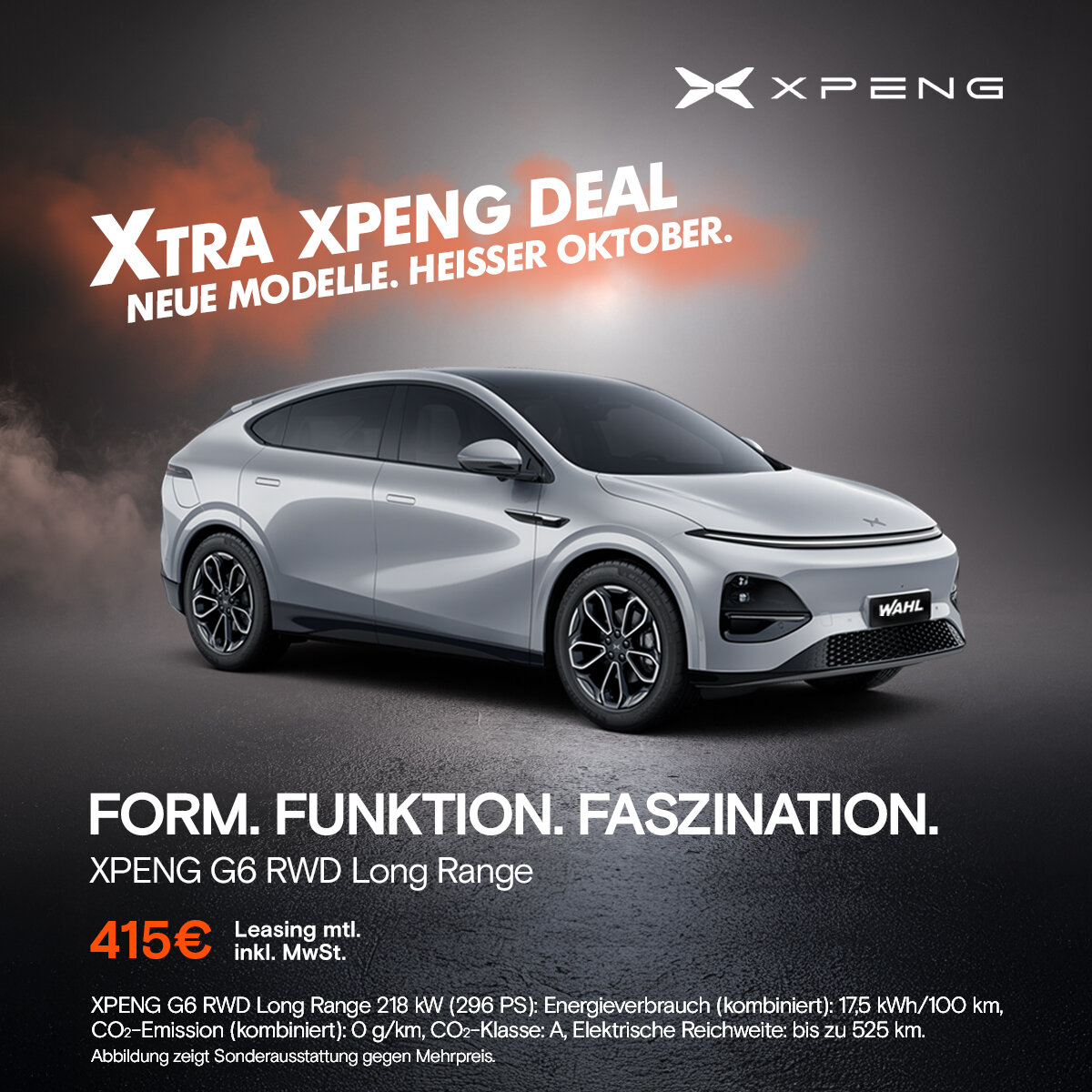 Ein unverbindliches Privat-Leasingangebot der Bank ARVAL Deutschland GmbH, Bajuwarenring 5, 82041 Oberhaching für das Fahrzeug: XPENG G6. Alle Preise verstehen sich inkl. MwSt und zzgl. 1.400,00 EUR (inkl. MwSt, seperate Berechnung) Transportkosten. Angebot gilt bis zum 31.12.2025. Abbildung zeigt Sonderausstattung gegen Mehrpreis.