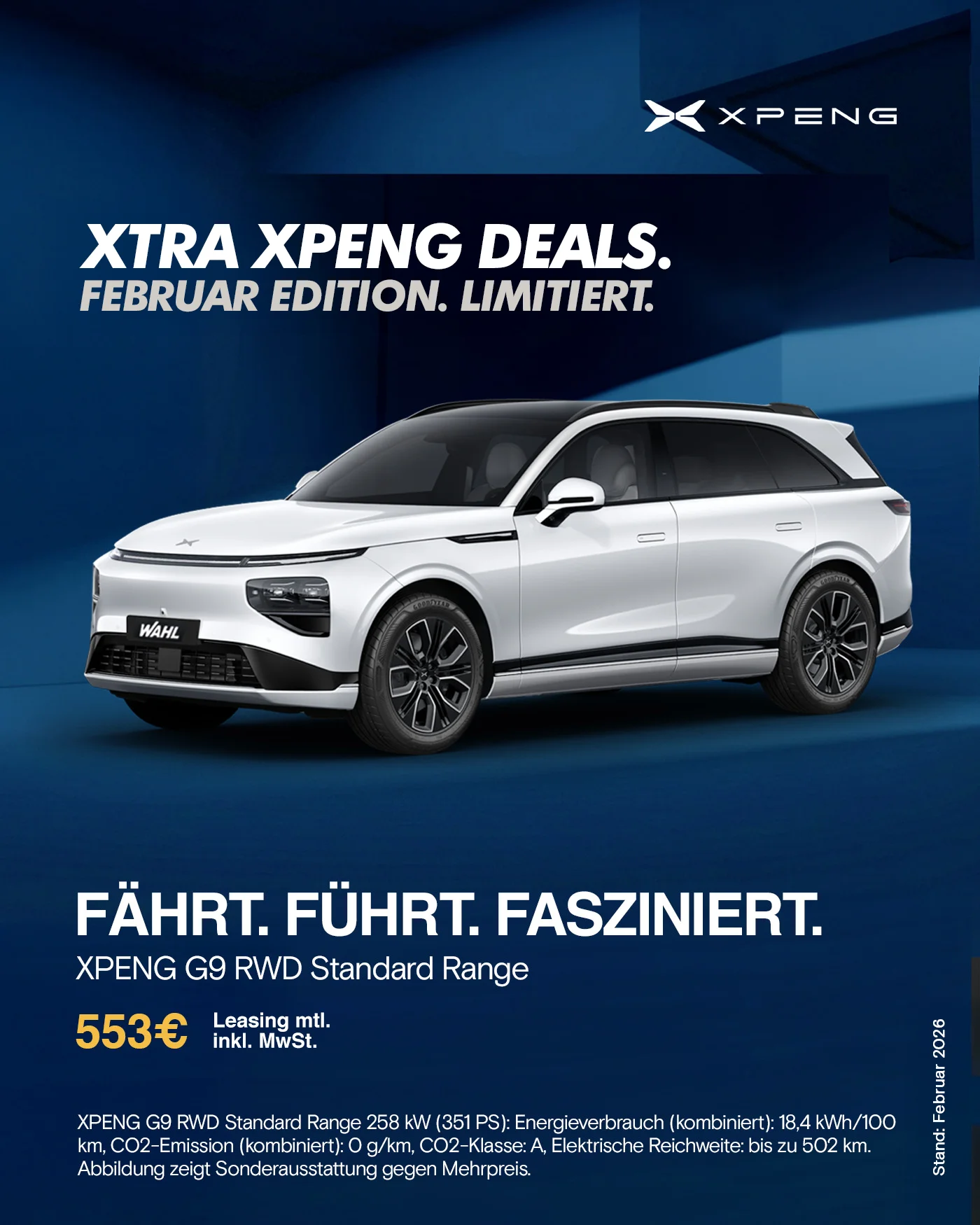 Ein unverbindliches Privat- oder Gewerbeleasingangebot der Bank ARVAL Deutschland GmbH, Bajuwarenring 5, 82041 Oberhaching für das Fahrzeug: XPENG G9. Alle Preise verstehen sich inkl. bzw. zzgl. MwSt und zzgl. 1.400,00 EUR (inkl. bzw. zzgl. MwSt, seperate Berechnung) Transportkosten. Angebot gilt bis zum 31.03.2026. Abbildung zeigt Sonderausstattung gegen Mehrpreis.