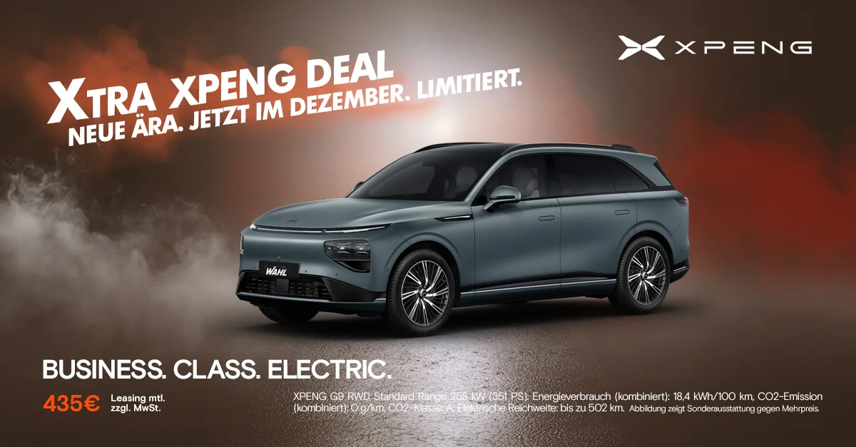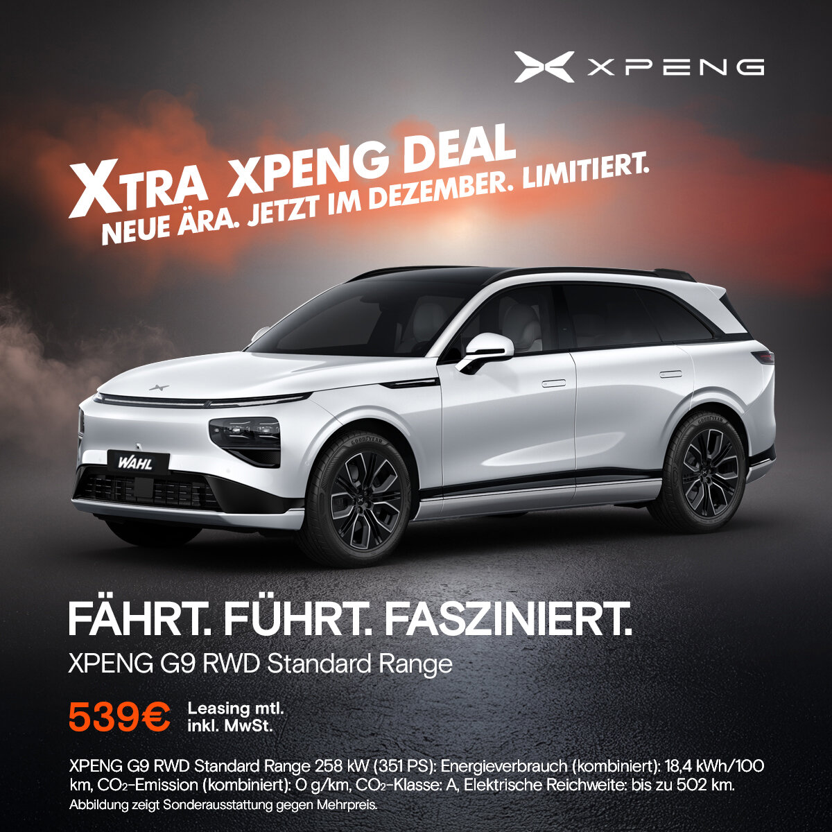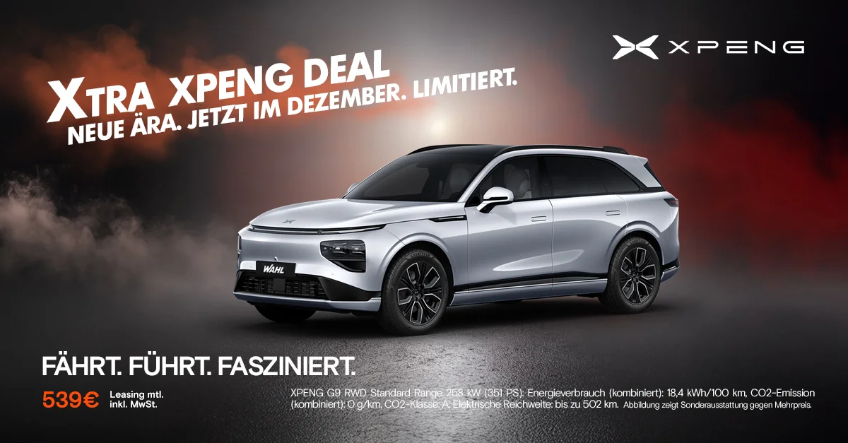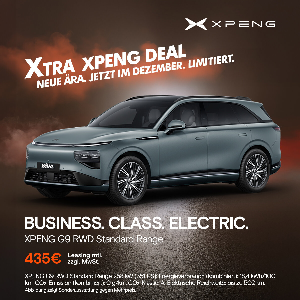 Ein unverbindliches Privat-Leasingangebot der Bank ARVAL Deutschland GmbH, Bajuwarenring 5, 82041 Oberhaching für das Fahrzeug: XPENG G9. Alle Preise verstehen sich inkl. MwSt und zzgl. 1.400,00 EUR (inkl. MwSt, seperate Berechnung) Transportkosten. Angebot gilt bis zum 31.12.2025. Abbildung zeigt Sonderausstattung gegen Mehrpreis